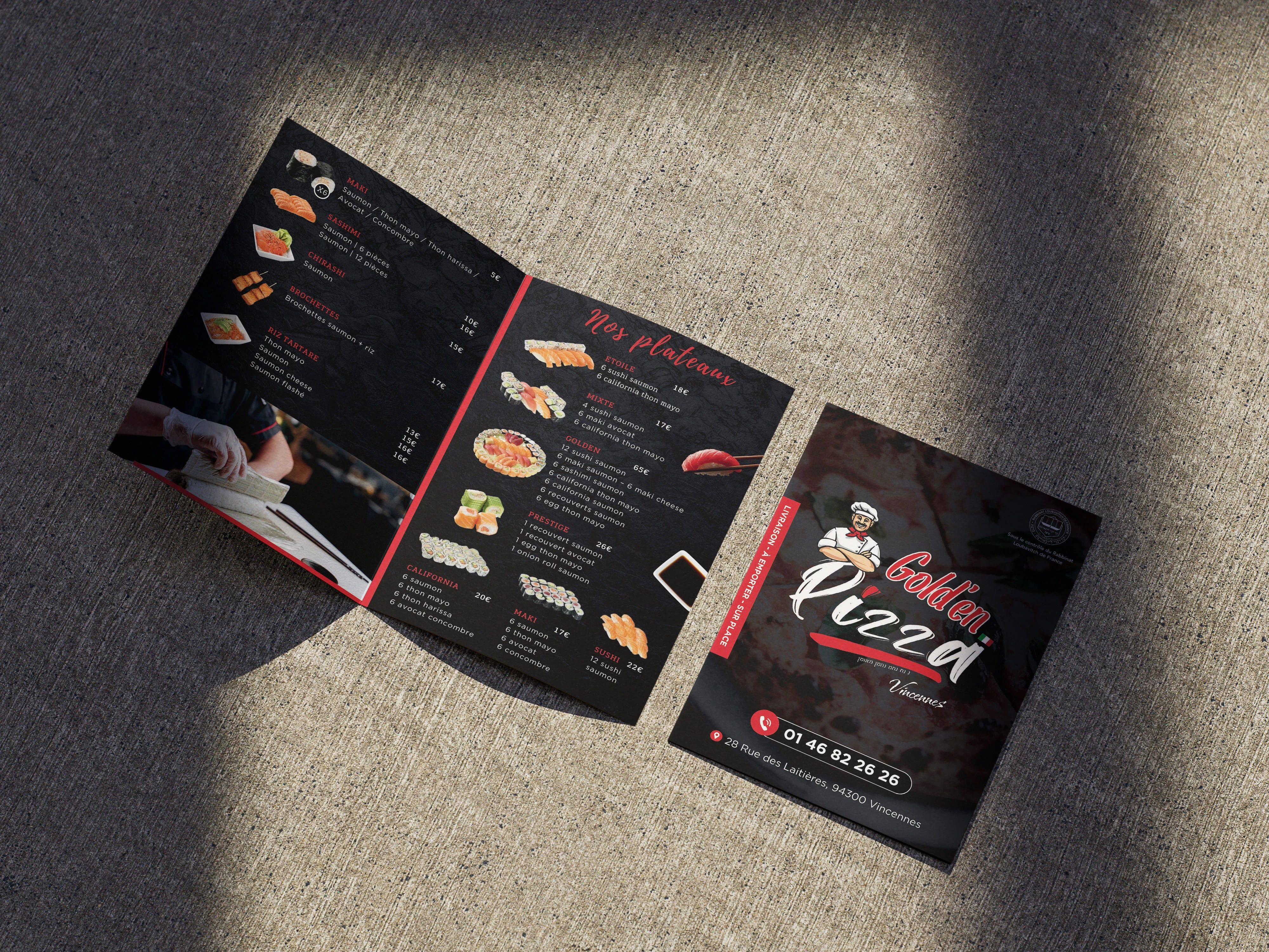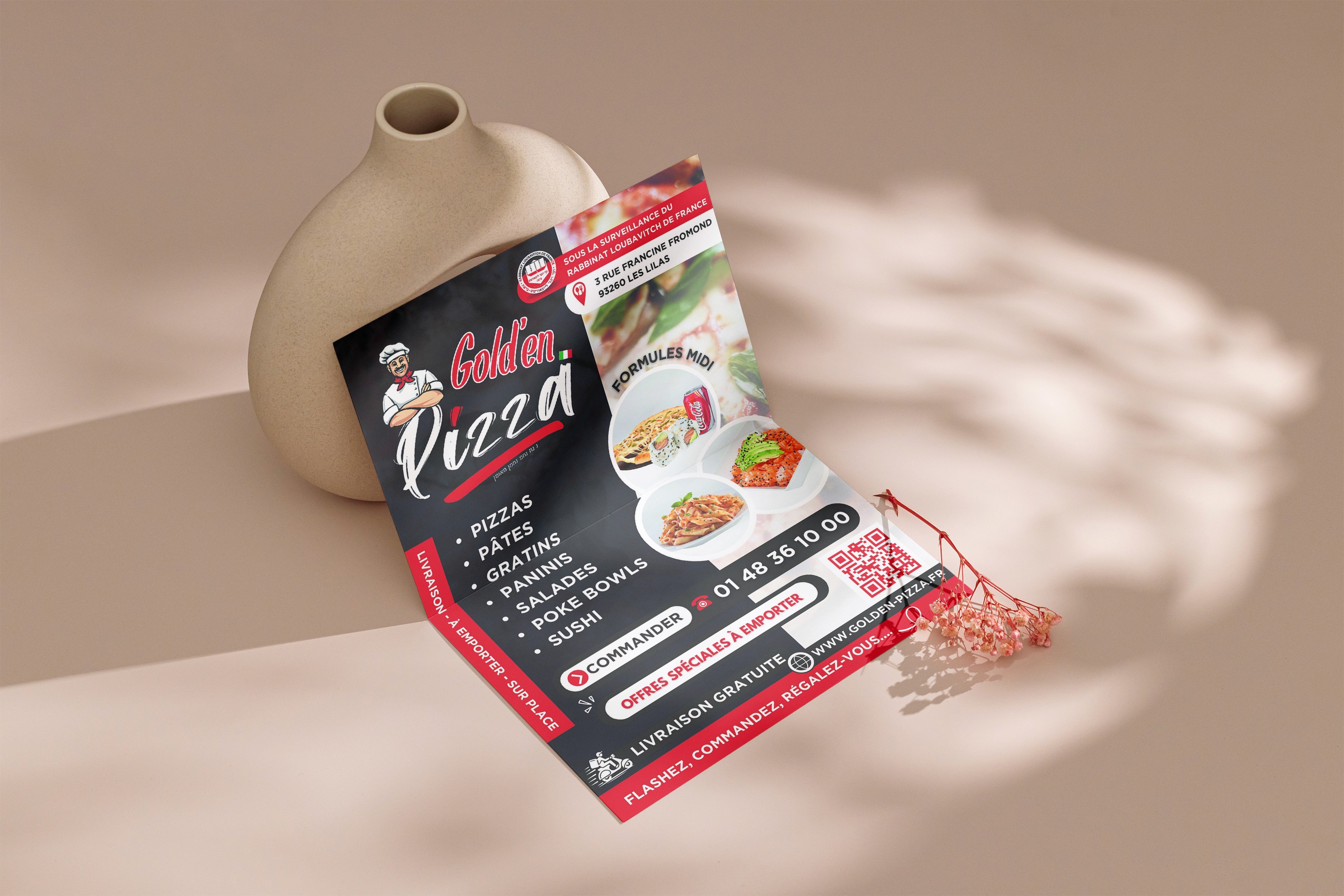 The result is a fresh and modern identity that strengthens Golden Pizza’s local presence. The new menus provide a premium experience for diners, while the communication through the flyer successfully captured the attention of new customers. The restaurant now feels contemporary and dynamic while remaining perfectly recognizable to its regulars.